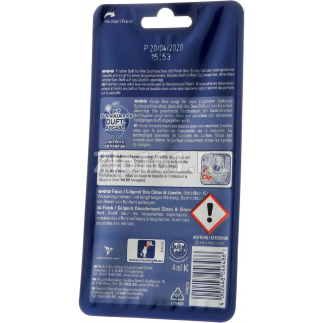 Освежитель Finish посудомоечных машин 00460742 Освежитель Finish для посудомоечных машин поглощает и нейтрализует неприятные запахи и гарантирует приятный аромат При этом на посуде не остаётся каких-либо запахов Когда Вы открываете посудомоечную машину, Вы ощущаете приятный цитрусовый аромат Освежитель Finish крепится на корзине для посуды моечной камеры с помощью специального фиксатора Освежителя хватит (в зависимости от частоты использования посудомоечной машины) примерно на 2-3 месяца - освежитель сохраняет аромат до 60 моющих циклов Объем: 5г Лайм и лимон