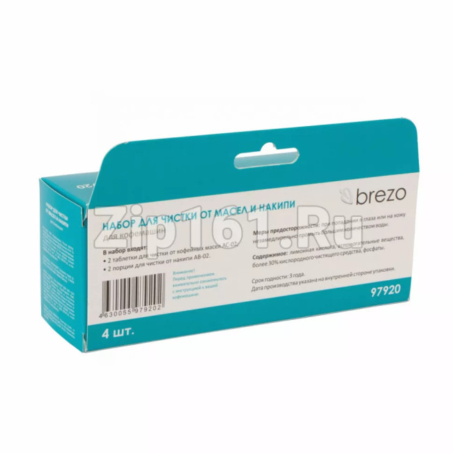 Набор для чистки кофемашин от накипи, 2 таблетки, 2 порции Brezo 97920 Длина: 0.156 Ширина в упаковке, м: 0.045 Длина в упаковке, м: 0.156 Высота в упаковке, м: 0.06 Вес в упаковке, кг: 0.125 Вид индивидуальной упаковки: Коробка Состав: Лимонная кислота, вспомогательные вещества, кислородное чистящее средство (>30%), фосфаты
