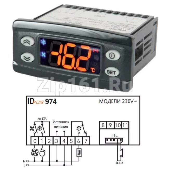 Приборы серий ID Plus 974 – это контроллеры с тремя цифровыми выходами (реле), двумя температурными датчиками (регулятора и испарителя), одним мультифункциональным входом, который может использоваться как цифровой вход или как датчик температуры и одним цифровым входом, подключаемым к TTL порту прибора. Релейные выходы 2 и 3 можно запрограммировать для управления: компрессором, нагревателем разморозки, вентилятором испарителя, дополнительной нагрузкой, сигнализацией об аварии, сигнализации о переходе в режим ожидания. Второй датчик температуры может использоваться для управления Разморозкой и вентилятором испарителя. Цифровые входы (D.I.1 и D.I.2) могут использоваться для: режима сохранения энергии (экономии), запуска режима разморозки, управления дополнительной нагрузкой, в качестве реле двери, для перевода прибора в режим ожидания, для подачи сигнала внешней аварии, для запуска цикла глубокой заморозки, в качестве реле давления, для запуска журн