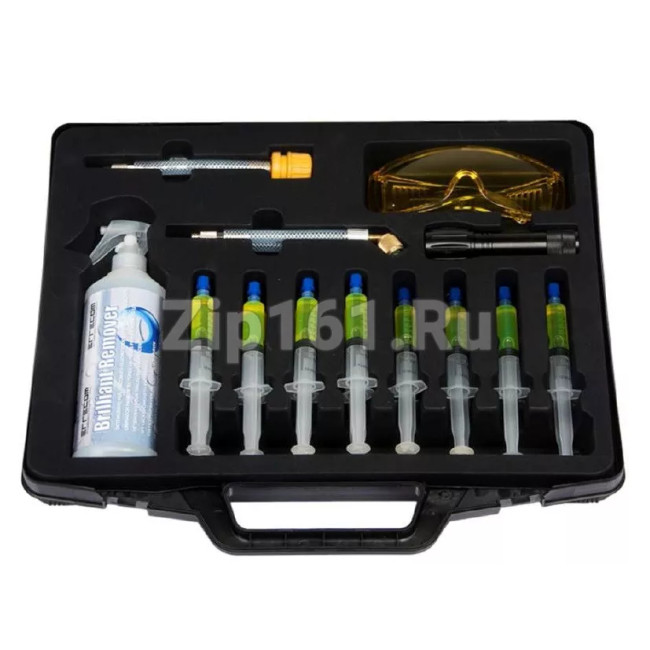 Набор для поиска утечек фреона Errecom RK1241 Fast Leak Finder – универсальный набор как для автокондиционеров, так и для установок промышленного холода, включающий все необходимое для добавления красителя в установку, ее обследования и последующего удаления остатков красителя. Набор включает: 12 доз по 7,5 мл (1/4 FL. OZ.) Brilliant.; Наклейки.400 мл (13.6 FL. OZ.); флакон-спрей Brilliant Remover.; Адаптер для порта низкого давления систем с R134a.120 мм адаптер 1/4 SAE с обратным клапаном.; 120 мм 120 мм адаптер 5/16 SAE (R410a) с обратным клапаном.; Лампа 9 UV LED.Очки: 100% защита от ультрафиолетовых лучей.;
