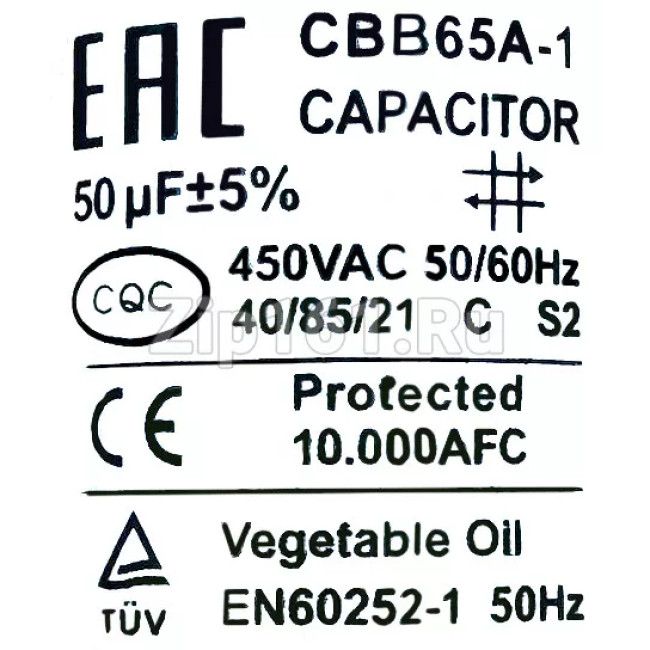 Конденсаторы CBB65 – металлизированные полипропиленовые пленочные конденсаторы постоянной ёмкости в герметизированном цилиндрическом корпусе, накапливают заряд от 4мкФ до 150мкФ при рабочем напряжении переменного тока 450В и 630В. Конденсатор CBB65 может применяться как пусковой или рабочий. Предельное допустимое отклонение ёмкости ±5%. По основным характеристикам являются ами конденсаторов К78-17.